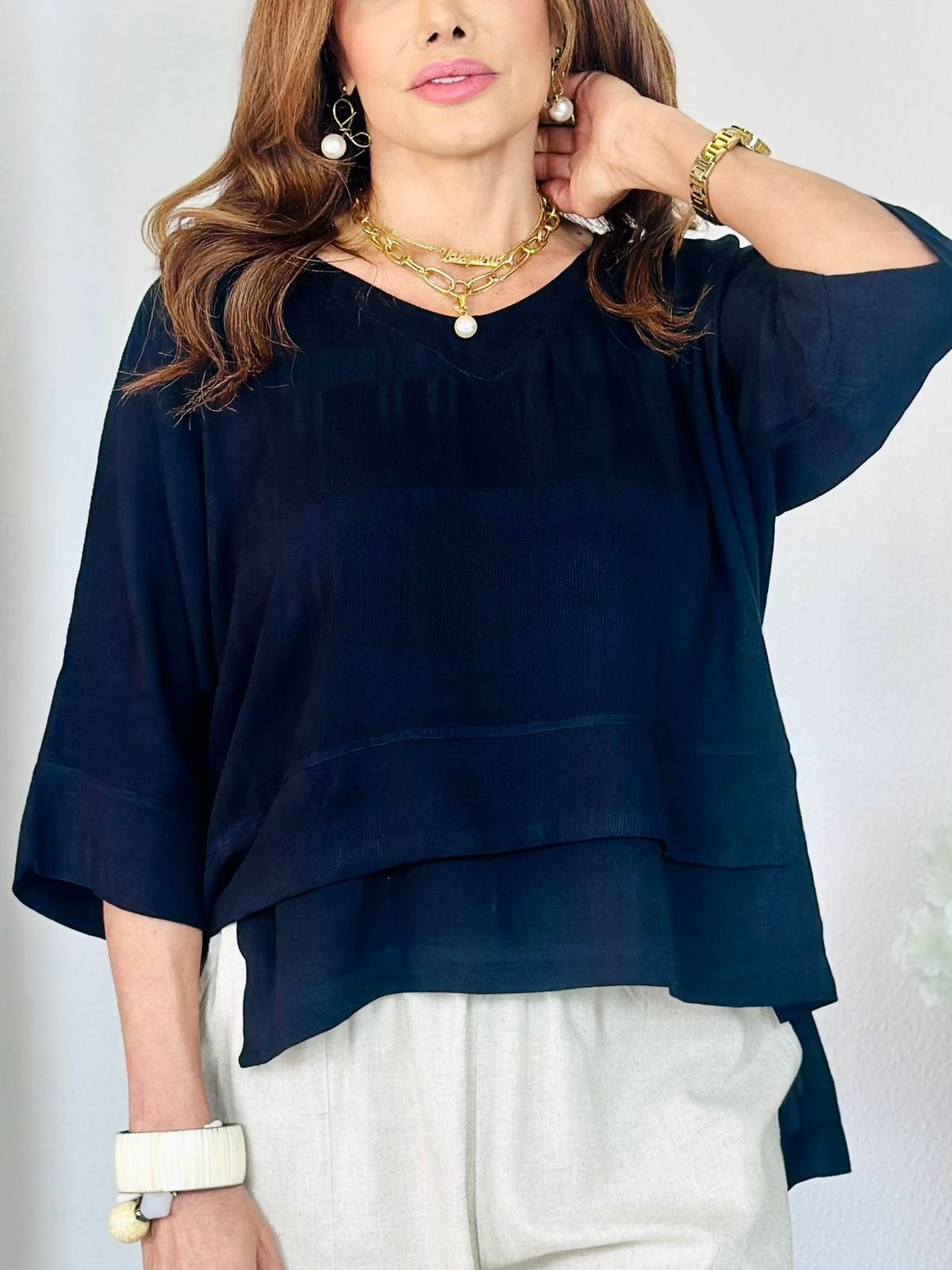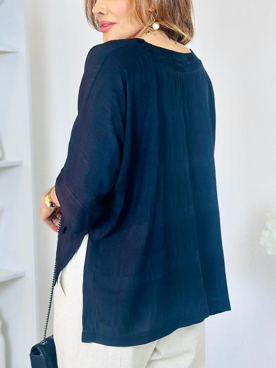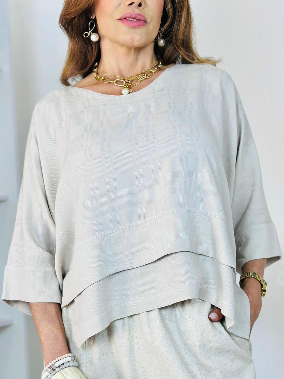 Blusa com decote redondo, barra assimétrica confeccionado no tecido twill cilindro, 100% viscose.
