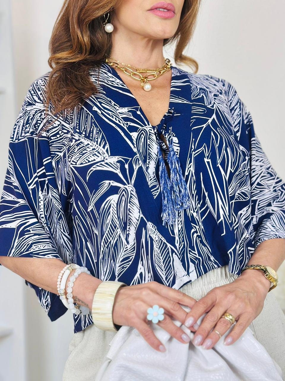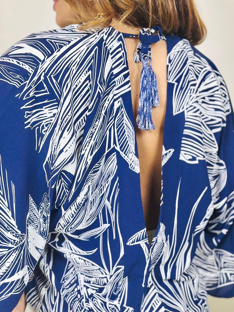 Blusa com decote em V, na frente e nas costas, possuindo amarração em ambos, confeccionado no tecido twill cilindro, 100% viscose.