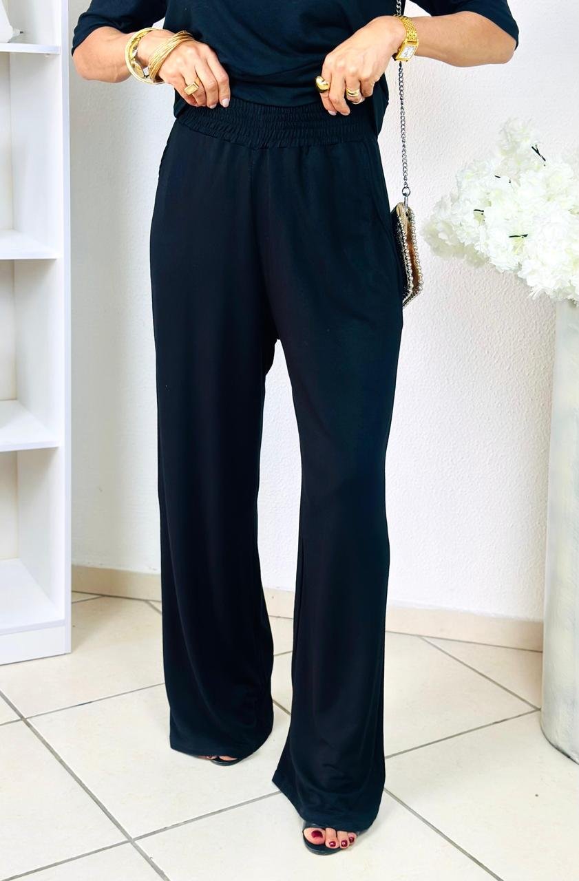 Conjunto composto de calça com modelagem reta e blusa com decote V, confeccionado no tecido moletinho, 96% viscose e 4% elastano.
