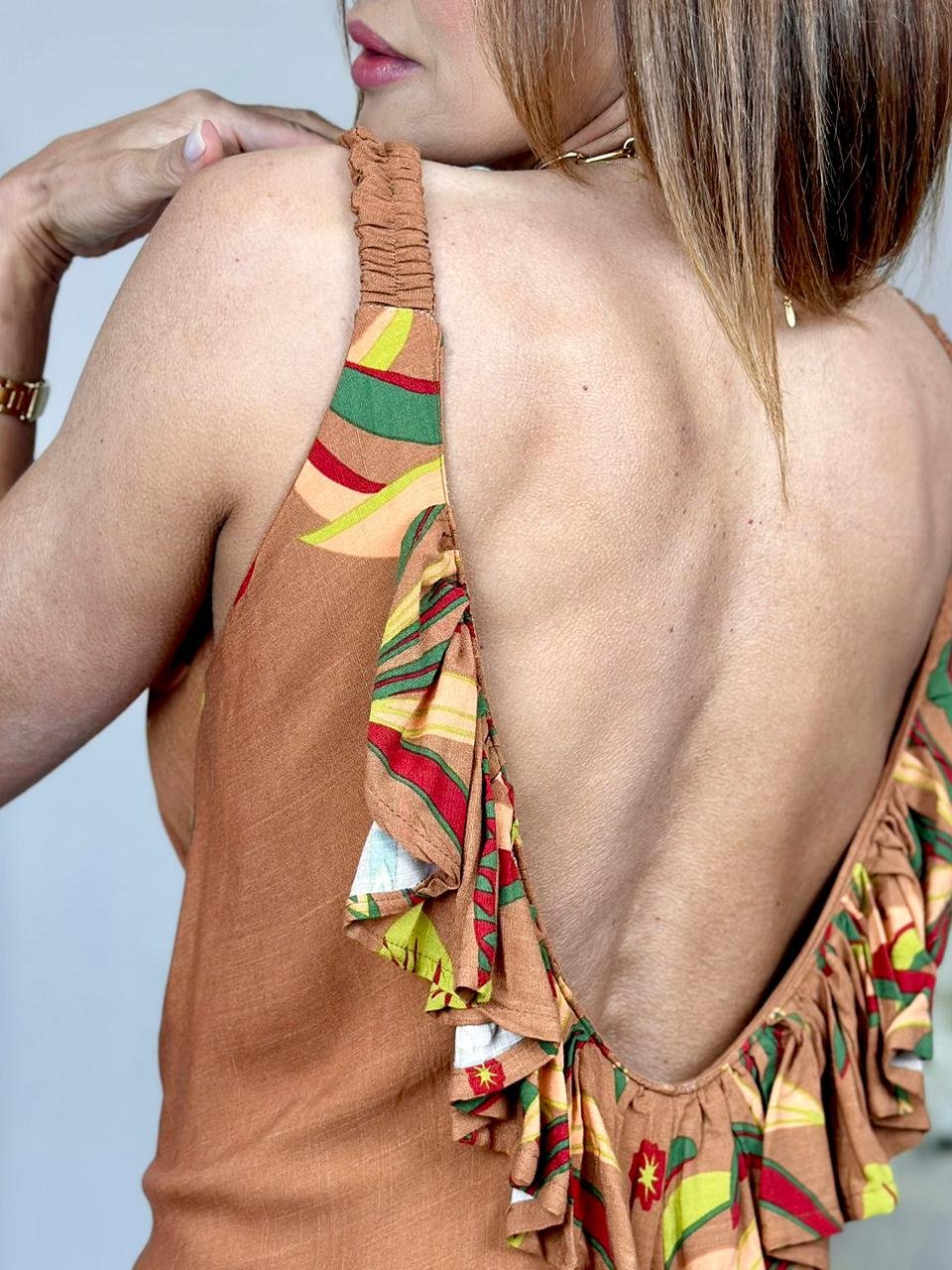 Vestido rodado, com babado na barra e nas costas, decote V e alças com elástico, confeccionado no tecido twill cilindro, 100% viscose.
