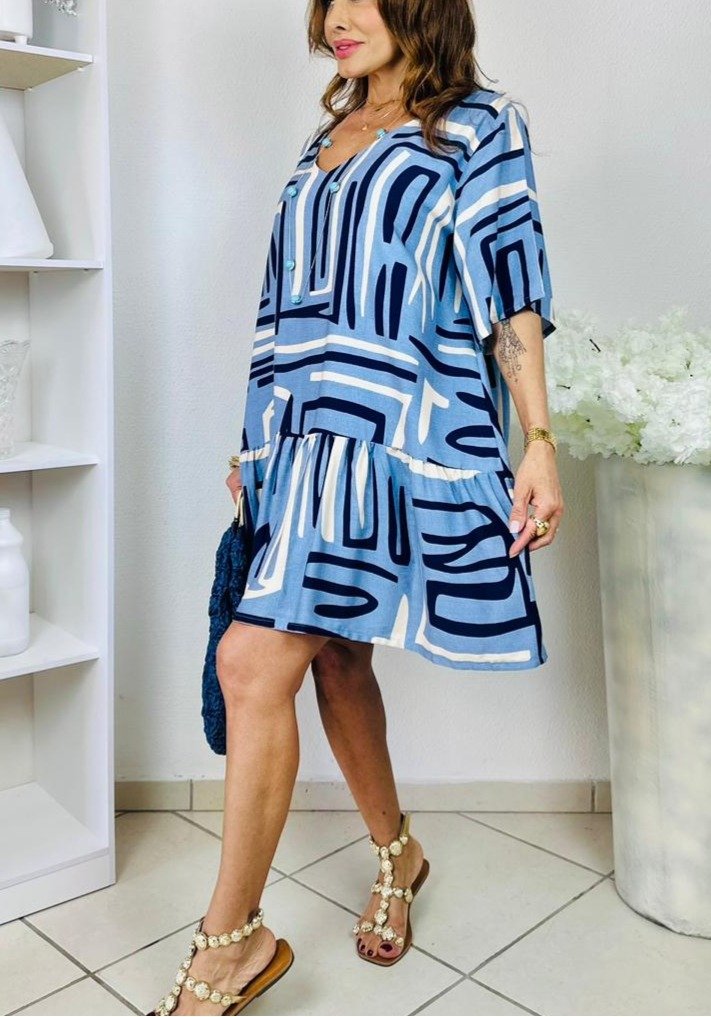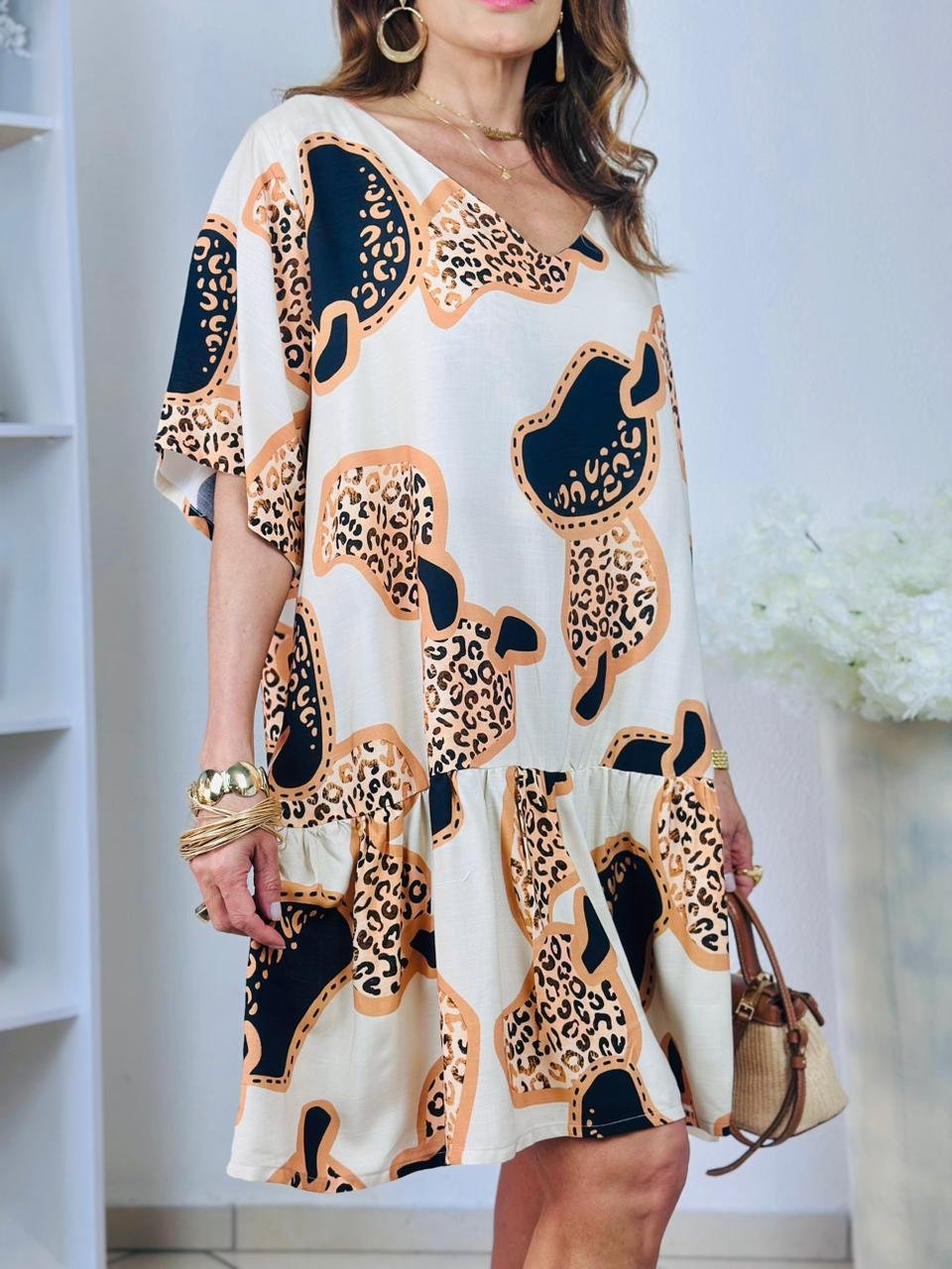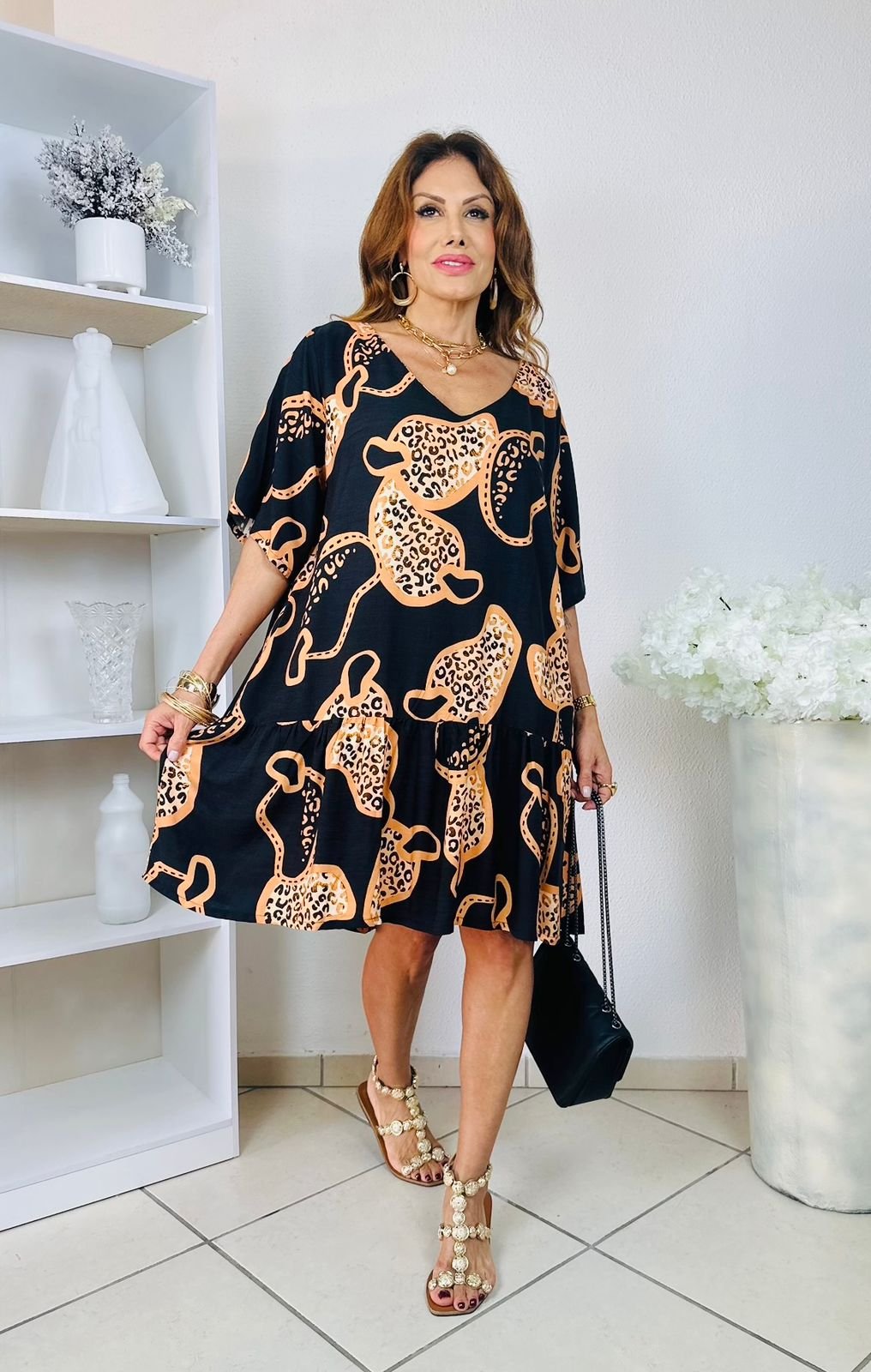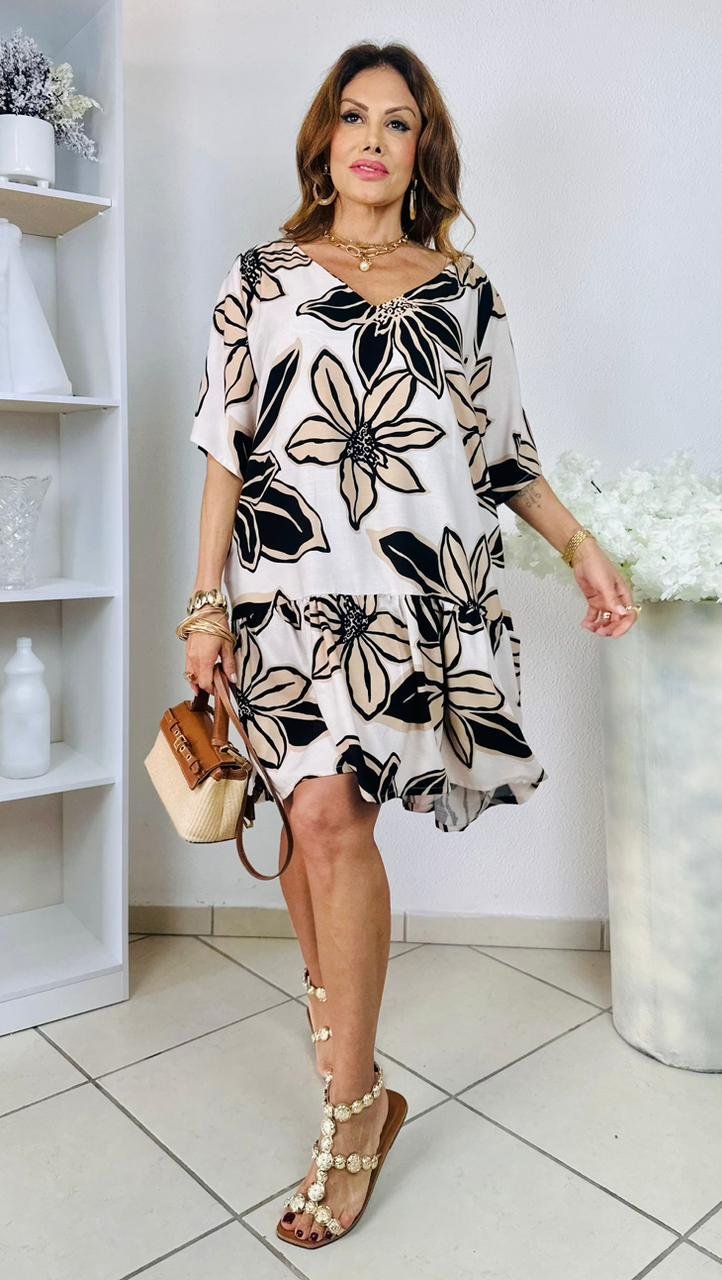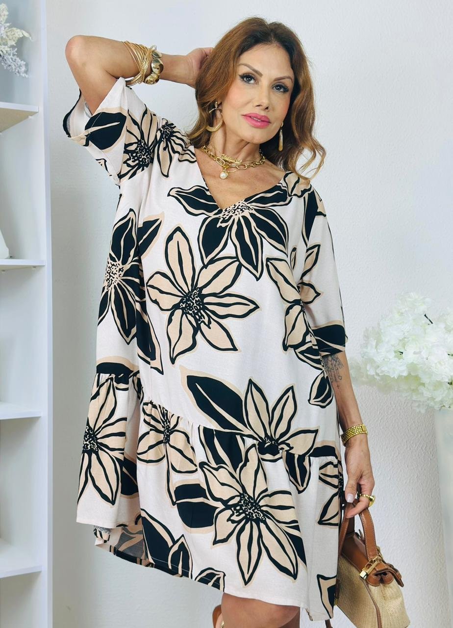 Vestido curto, com babado na barra, com modelagem mais reta e ampla, confeccionado no tecido twill cilindro, 100% viscose.