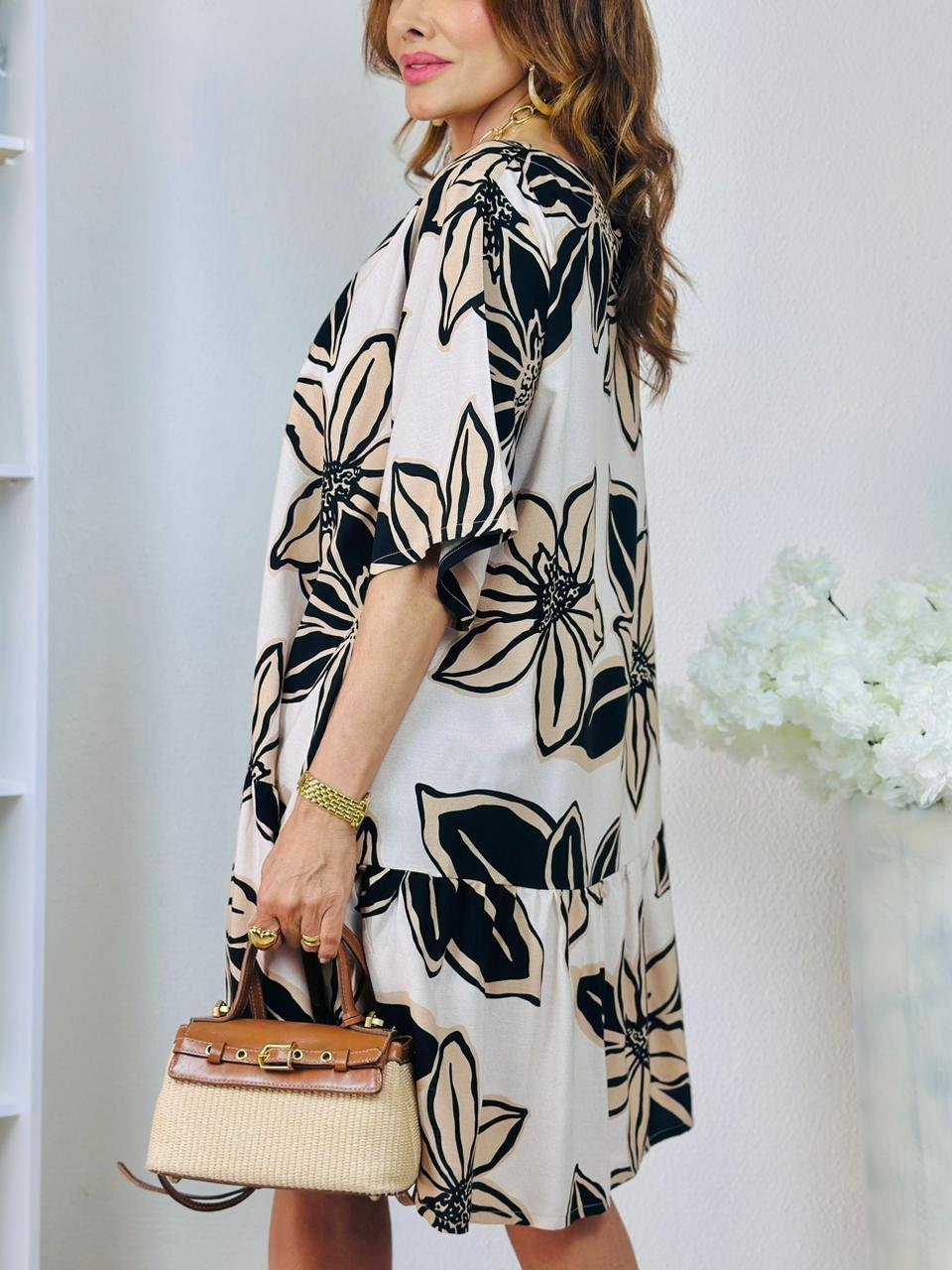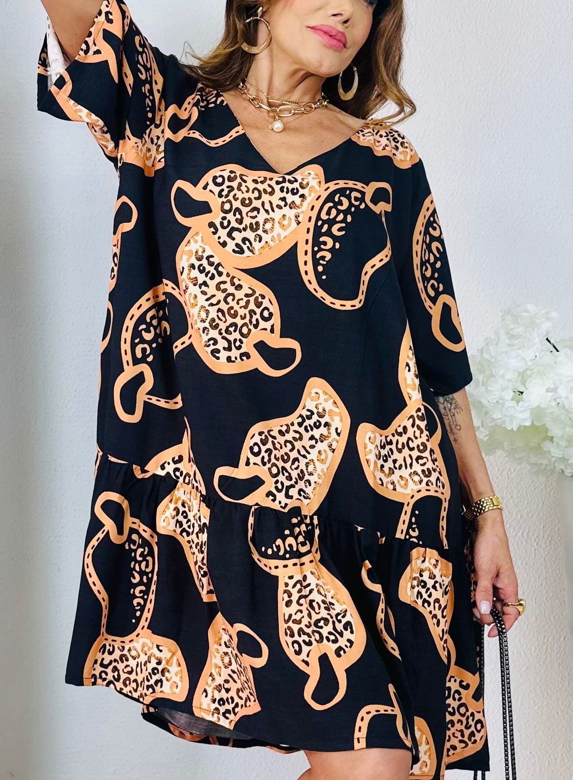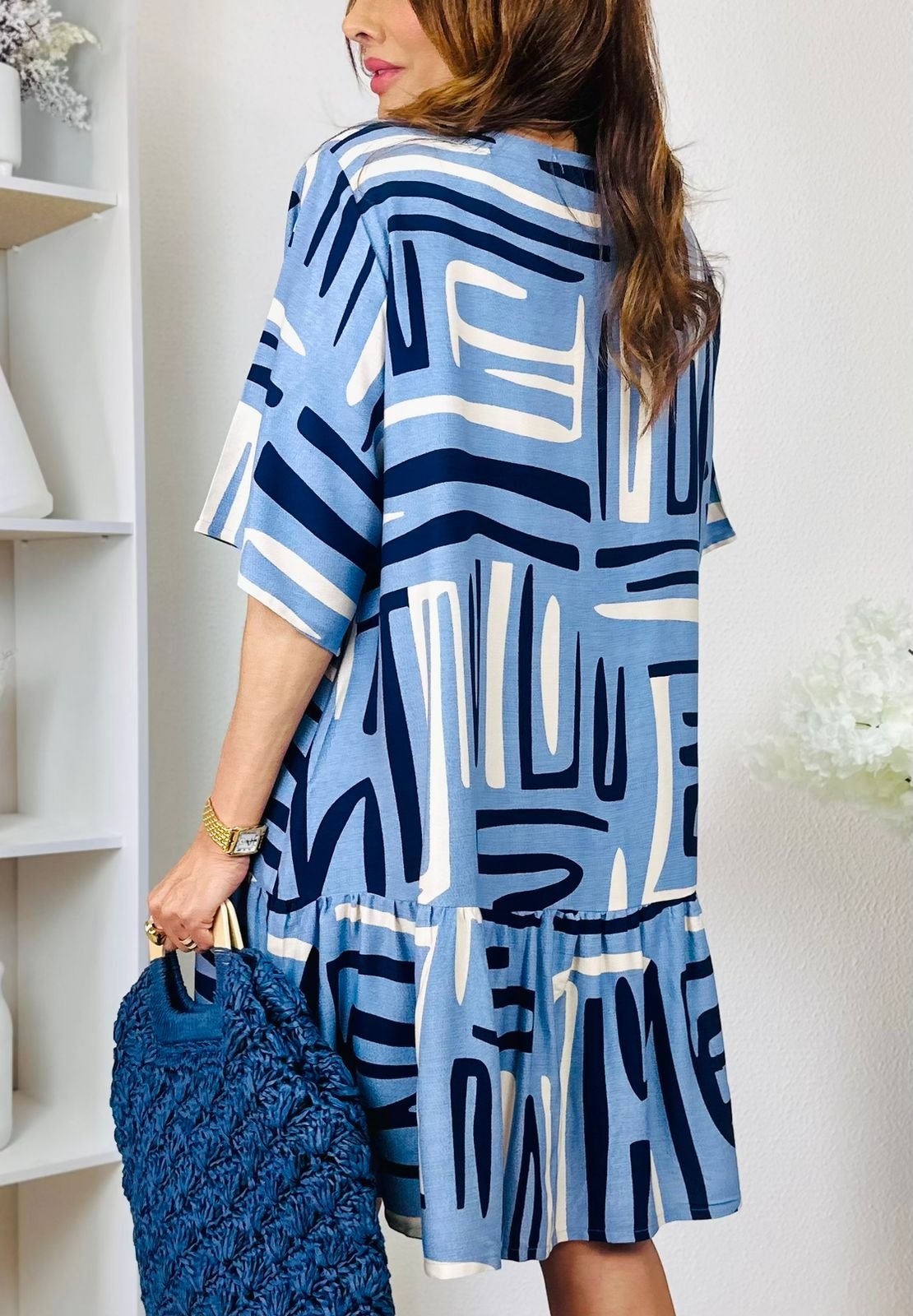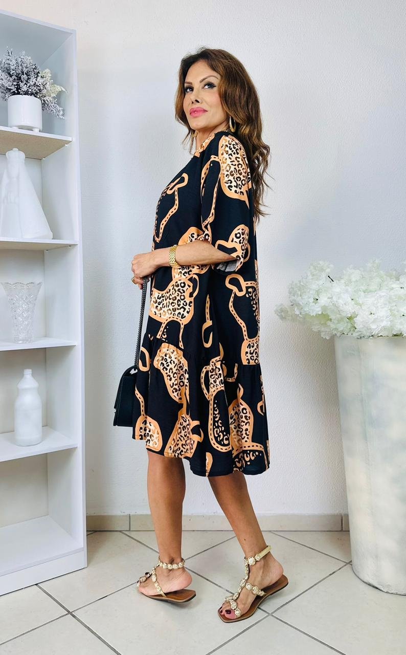 Vestido curto, com babado na barra, com modelagem mais reta e ampla, confeccionado no tecido twill cilindro, 100% viscose.