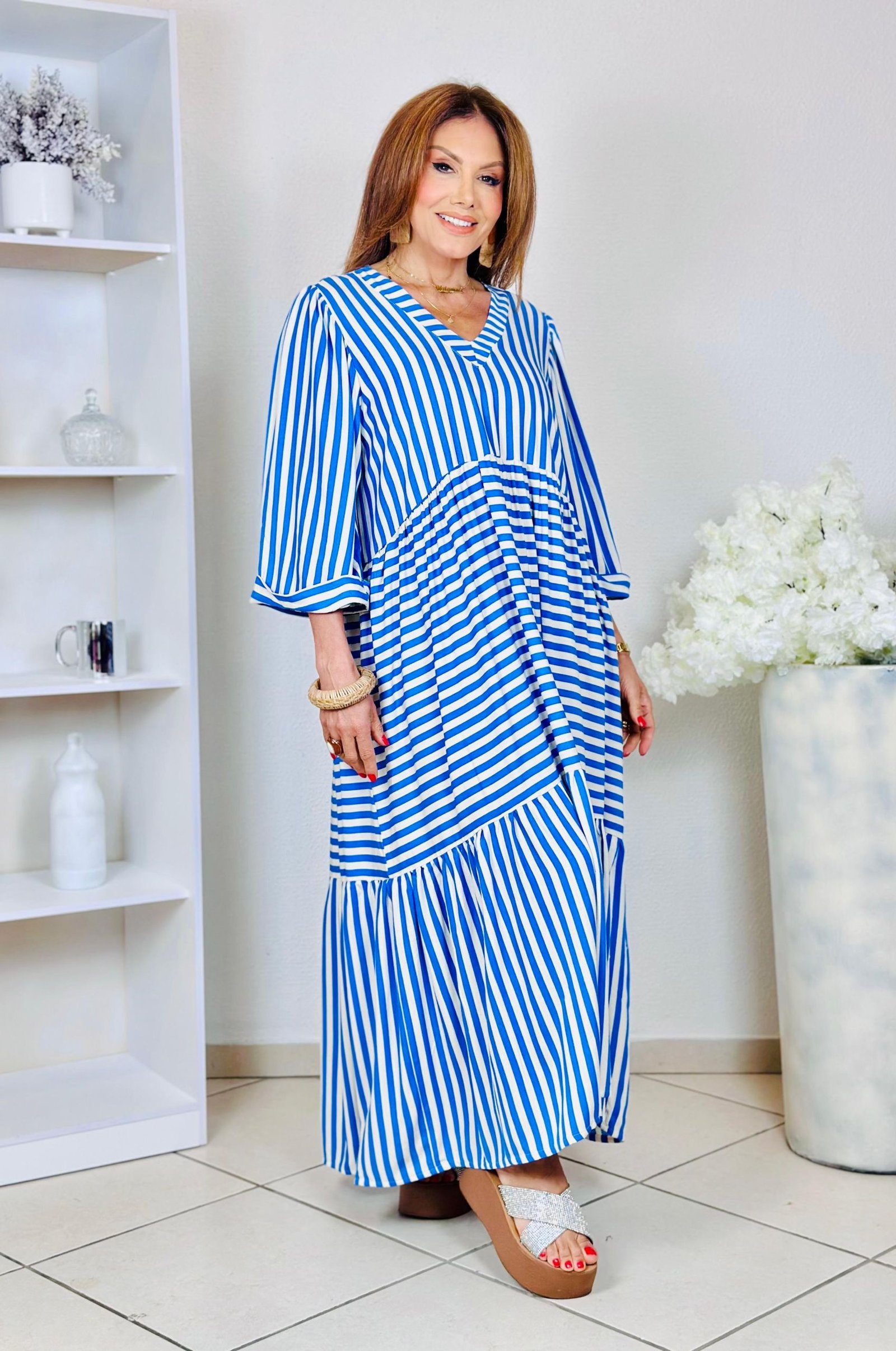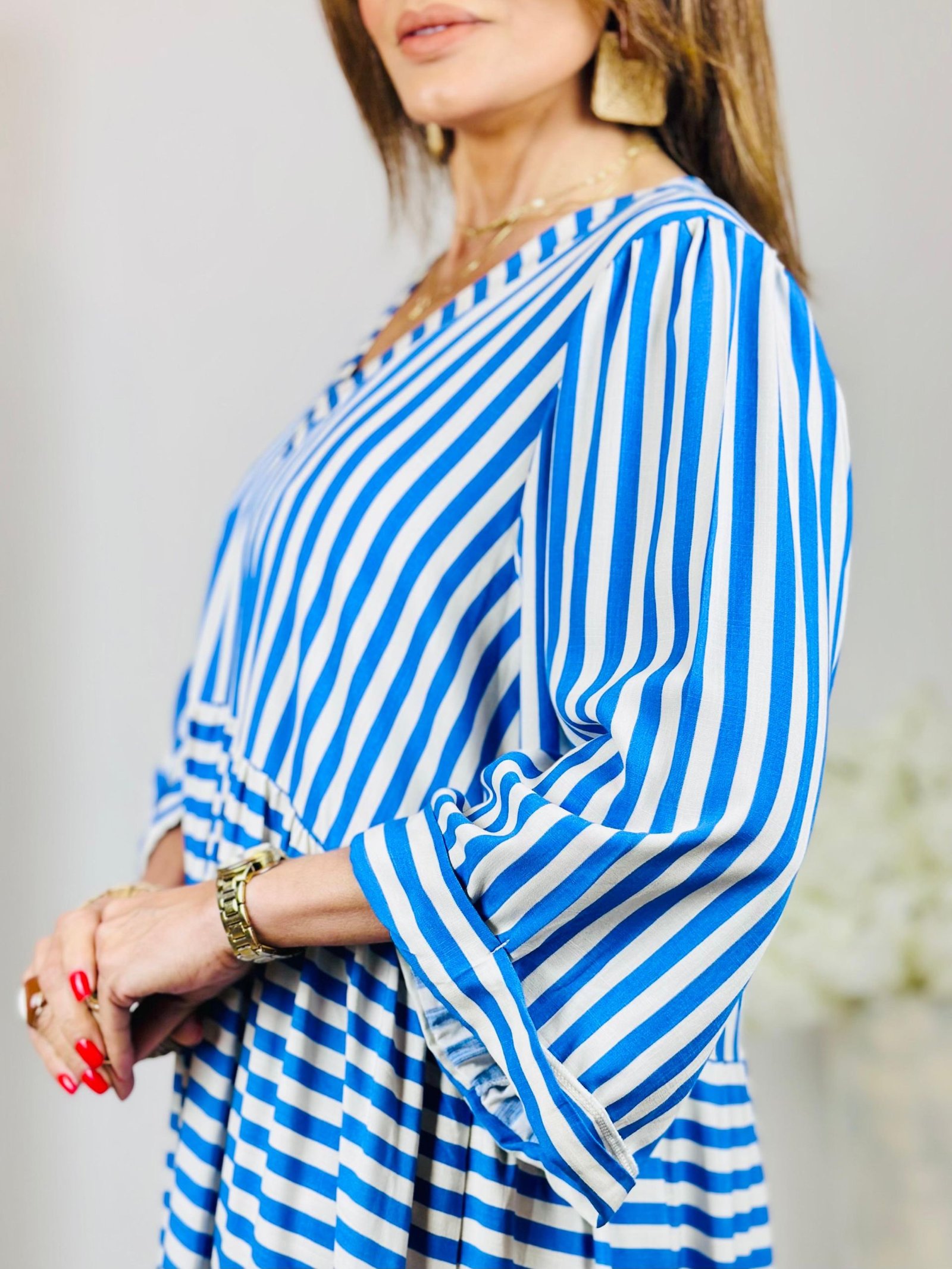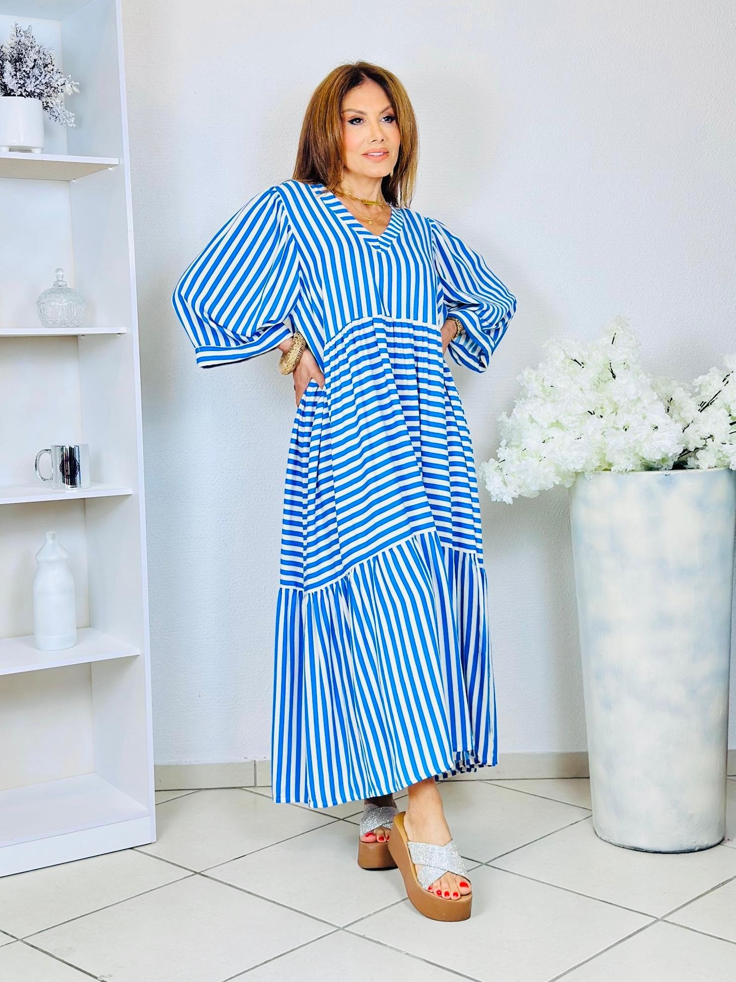 Estampa com fundo claro e listras azuis, trazendo o frescor do verão.